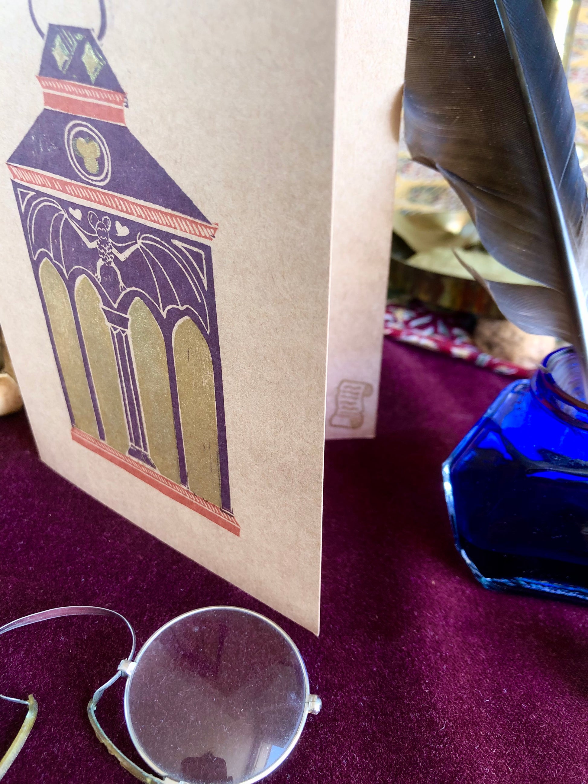 Carte de vœux imprimée d'une linogravure en trois couleurs et son enveloppe.
