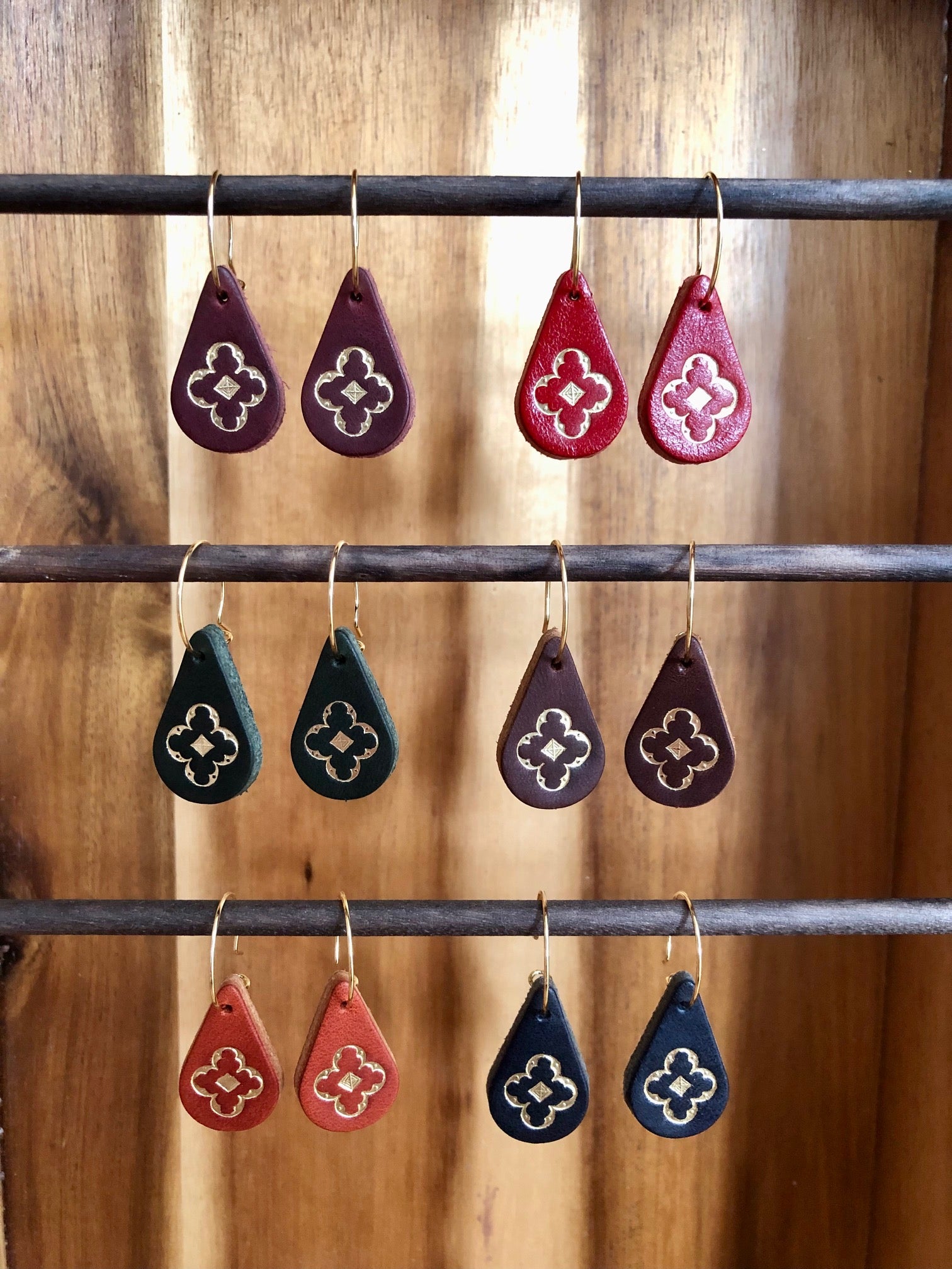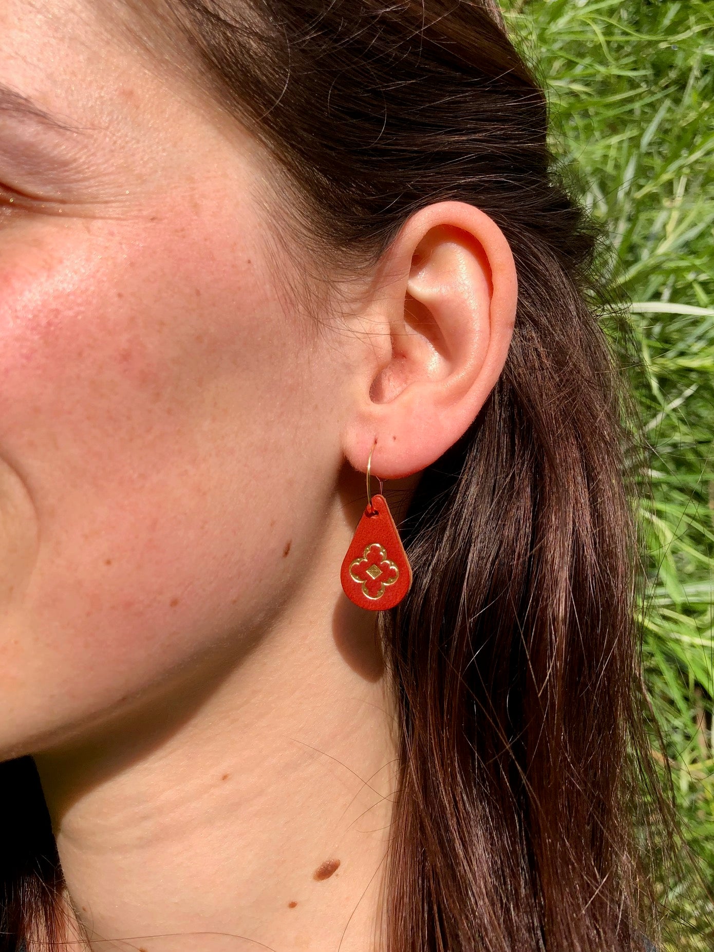 Des boucles d'oreilles en cuir colorées et hyper légères ornées de jolis motifs issus des arts du décor du livre.
