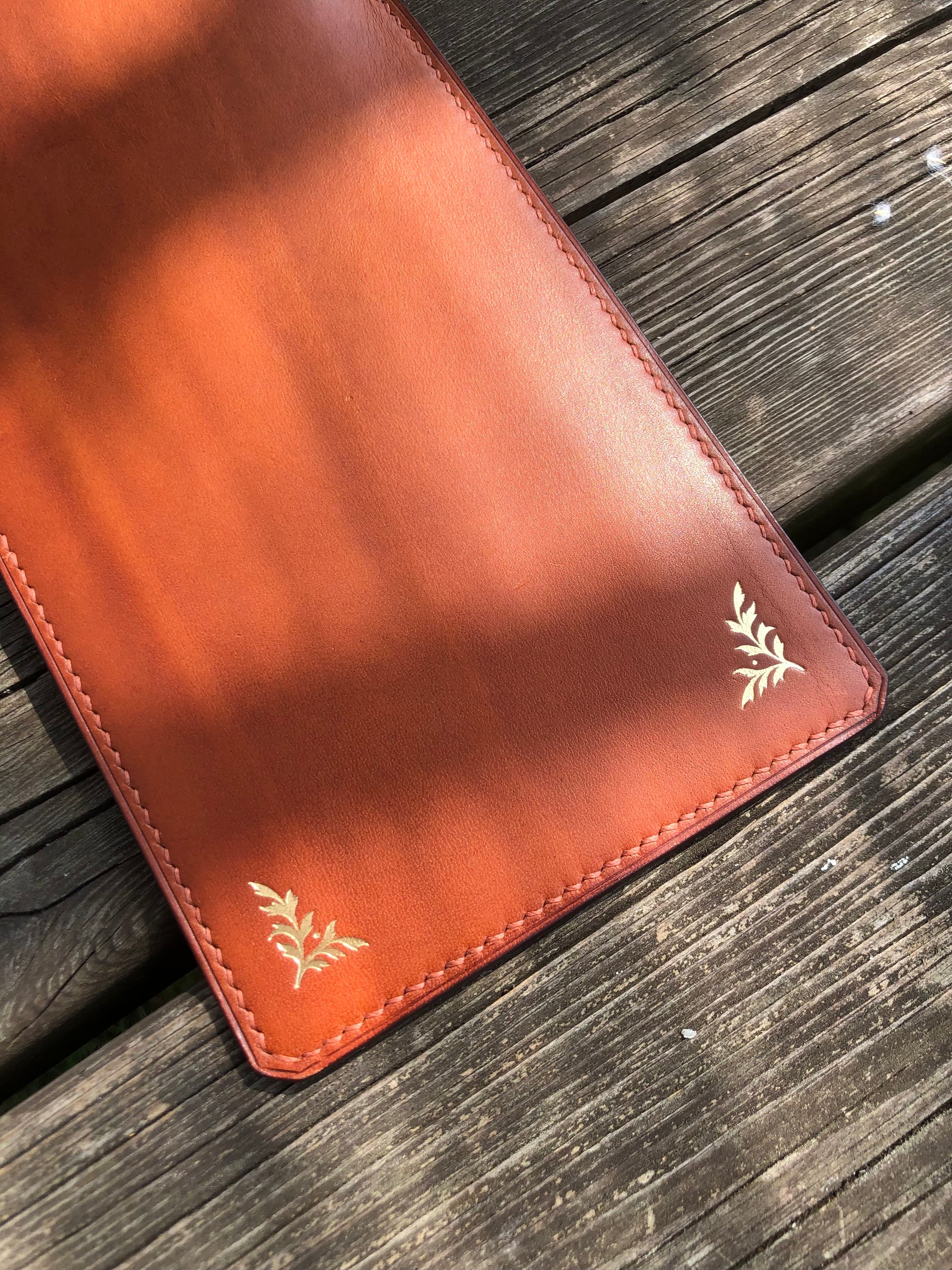 Etuis-pochette pour smatphone. Unisexe. Feuillage réalisé à l'or 22 carats selon les techniques de décors du livre.