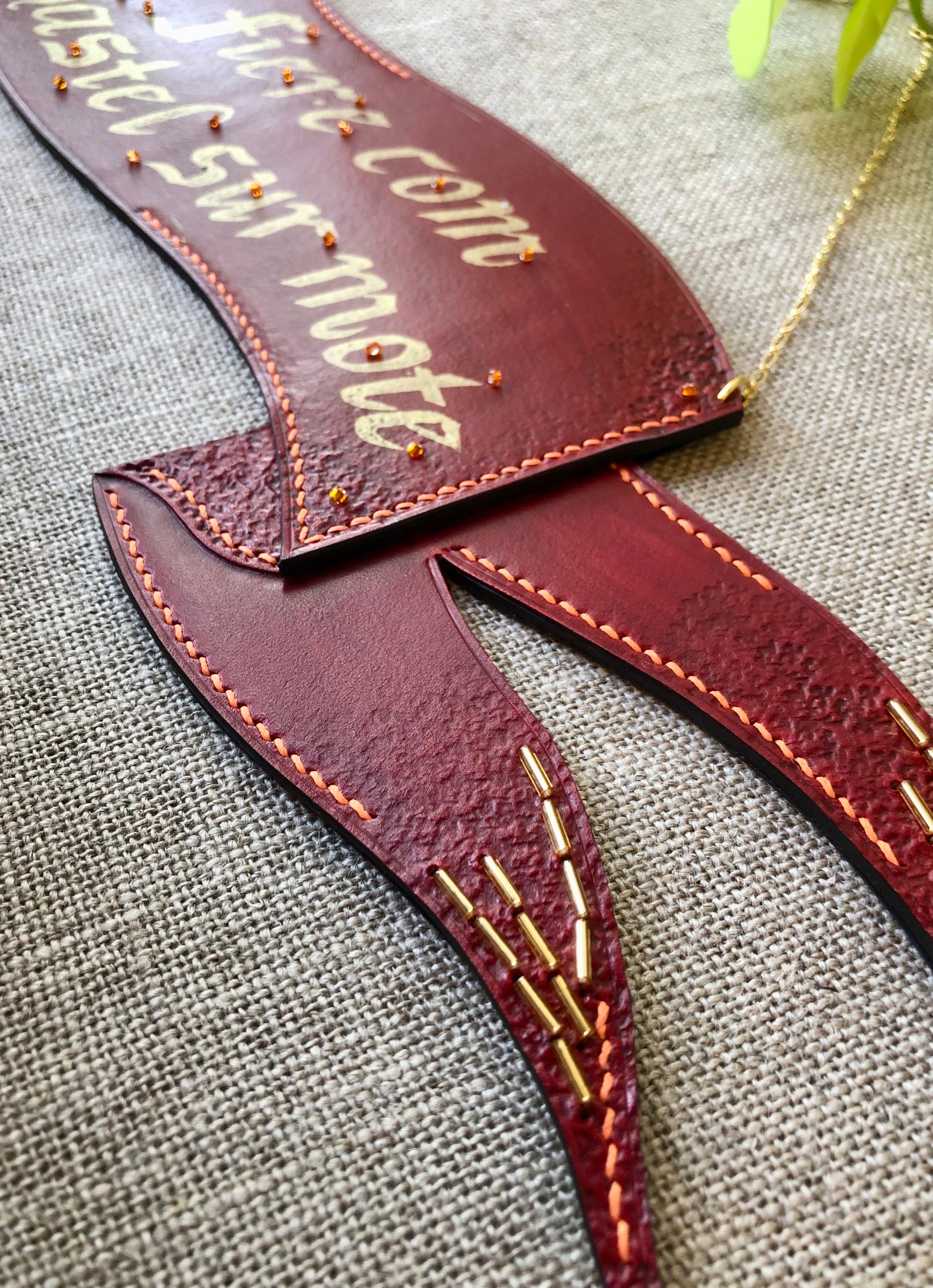 Cuir origine France premier choix, tout cousu main au point sellier, fil de lin et perle de verre.